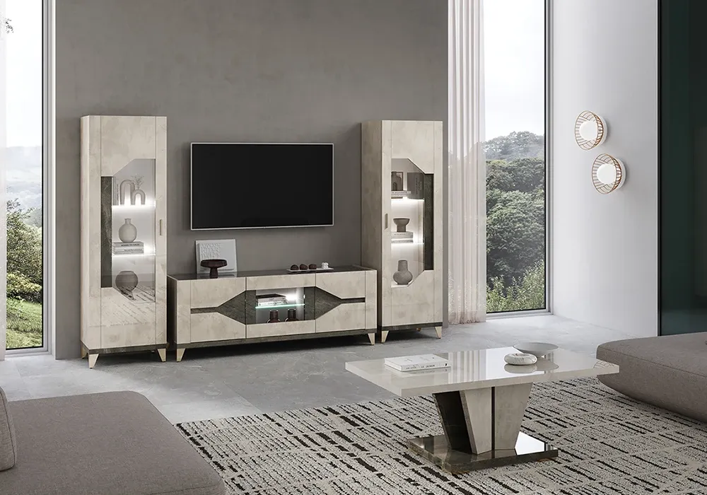 Ses pieds en acier coloris champagne ajoutent une touche de sophistication et de modernité. Les parties vitrées avec éclairage LED intégré créent une atmosphère chaleureuse et mettent en valeur vos plus beaux objets. Ce meuble allie fonctionnalité et raffinement, parfait pour enrichir votre espace de vie avec style.