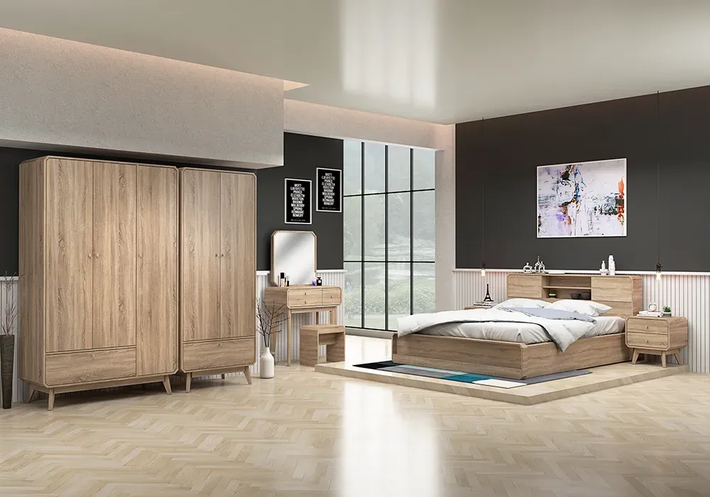 Structure en panneau de particules mélaminé recouvert de papier décor oak.