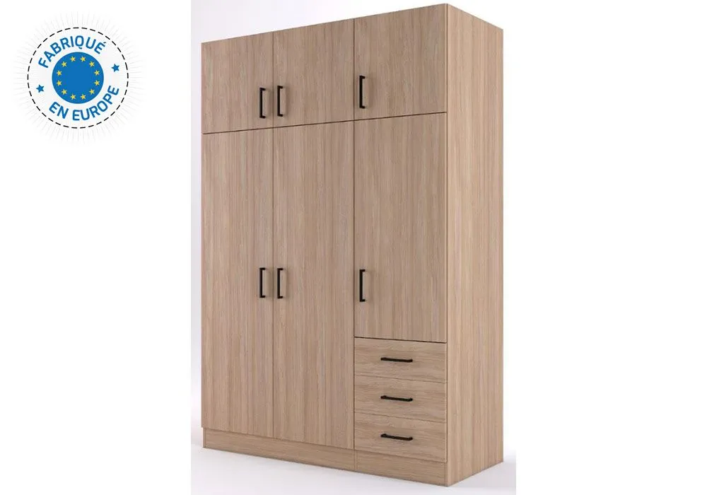 Vous rêvez d’une armoire dotée d‘espaces de rangement généreux ? L’armoire Brest dispose de 6 portes battantes et de 3 tiroirs. Vous aurez donc la place de stocker de nombreux vêtements sur les étagères et dans les penderies. La structure en panneaux de particules se caractérise par sa solidité et sa facilité de montage.
