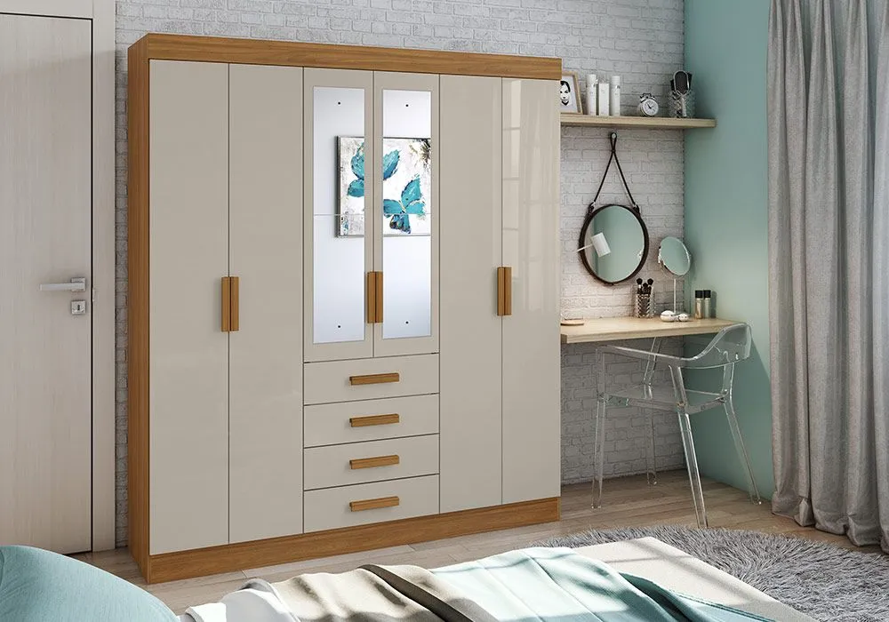 Vous rêvez d’une armoire dotée d‘espaces de rangement généreux ? Ce modèle dispose de 6 portes battantes et de 4 tiroirs. Vous aurez donc la place de stocker de nombreux vêtements sur les étagères et dans les penderies. La structure en panneaux de particules se caractérise par sa solidité et sa facilité de montage.