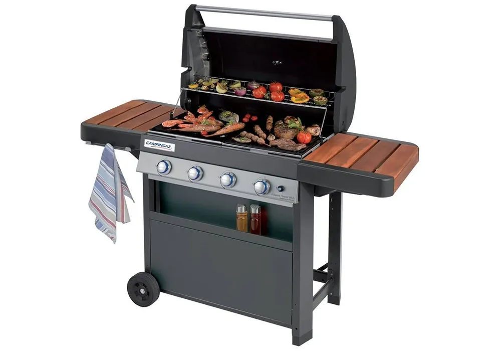 Il est équipé d’une surface de cuisson en acier de 3500cm², ses 4 brûleurs en inox ont une puissance de 12,8 kW. Son couvercle en acier émaillé et aluminium est équipé d’un indicateur de température pour contrôler la cuisson.