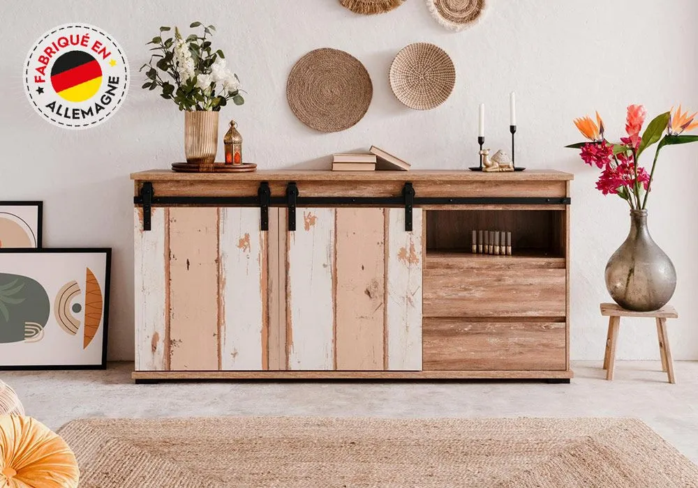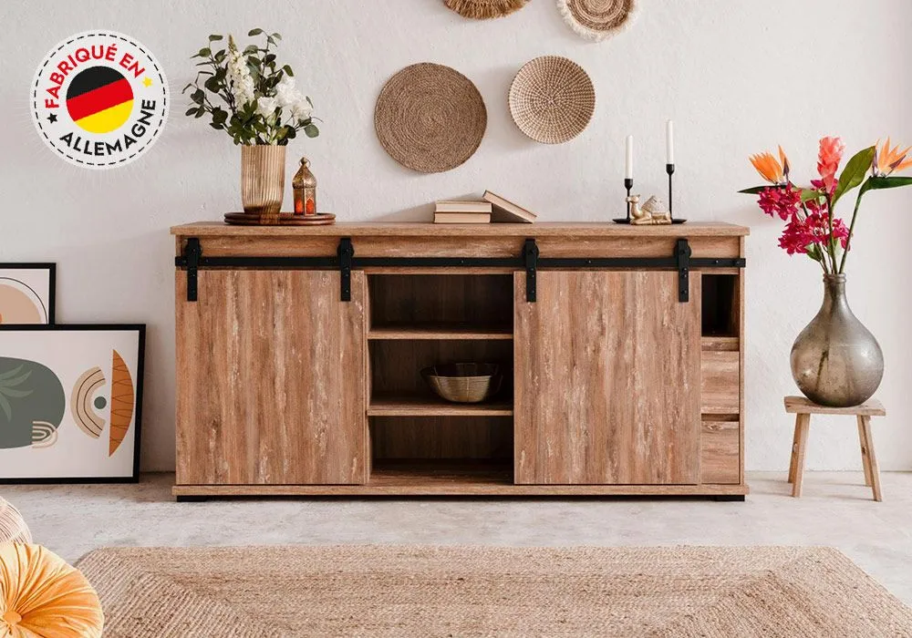 Ce somptueux buffet bas embellira votre séjour et ajoutera une touche design à votre intérieur. Il propose de multiples espaces de rangement. Habillé de tons naturels, il séduit pour son côté chaleureux. Ses couleurs s’accorderont parfaitement pour insuffler un style industriel dans votre pièce de vie.