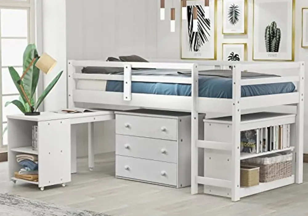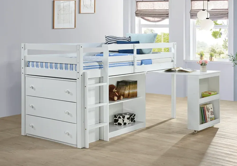 Doté d’une literie 90x190cm, il garantit un confort optimal pour des nuits paisibles. Ce lit combiné vous offre un couchage surélevé accessible à l’aide d’une échelle sécurisée, un bureau rétractable sur roulettes et de nombreuses zones de rangement.