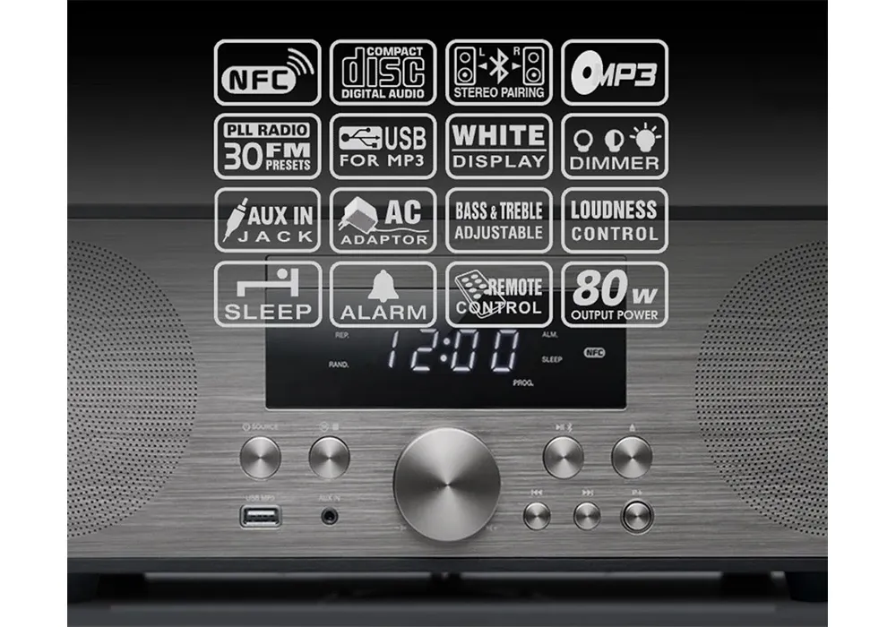 Offrez une expérience sonore complète avec cette micro-chaîne CD élégante et performante. Compatible avec les formats CD, CD-R/RW et MP3, elle dispose d’un mécanisme CD à tiroir pour une lecture facile. Profitez également de la radio FM PLL, qui mémorise jusqu’à 30 stations, et d’une fonction NFC pour un couplage rapide avec vos appareils Bluetooth.