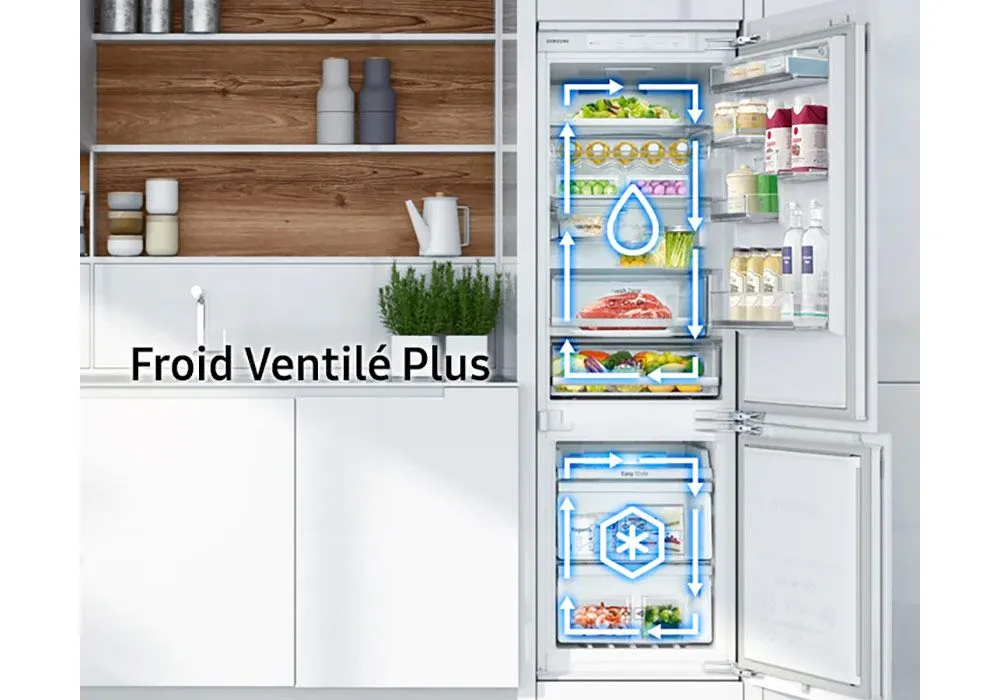 Ce réfrigérateur congélateur est doté du froid ventilé. Ce système produit un air froid et sec qui circule en permanence dans l’appareil. Cela garantit une absence totale de givre et une température uniforme dans tout l’appareil. L’entretien est facilité.
