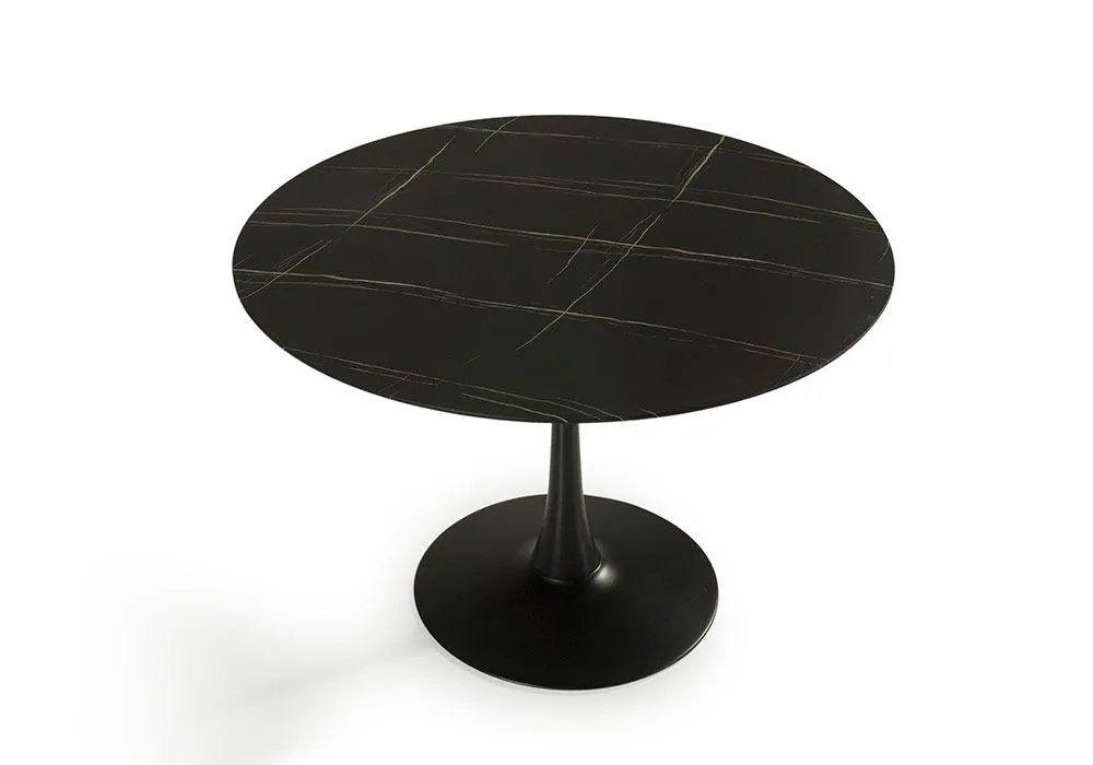 Piétement de la table en métal, plateau en panneau de particules imitation marbre coloris noir ou blanc.