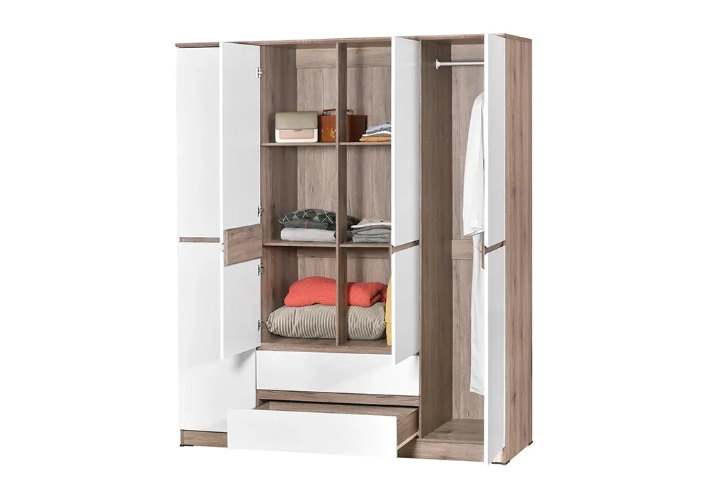 Ajoutez une touche d’élégance et de fonctionnalité à votre chambre avec cette superbe armoire 4 portes et 2 tiroirs Santorini. Conçue avec une structure en panneau de particules de haute qualité, elle est recouverte de papier au coloris blanc et chêne, offrant un contraste raffiné et moderne.