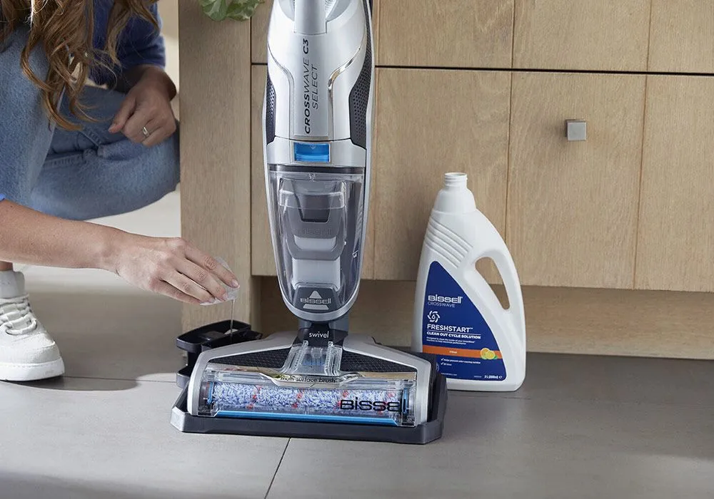- Le Bissell Crosswave C3 Select est un système de nettoyage multi-surfaces qui aspire et lave tous les types de sols : carrelage, parquet, moquette, tapis, stratifié, linoléum, tapis en caoutchouc, etc.