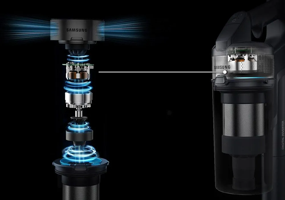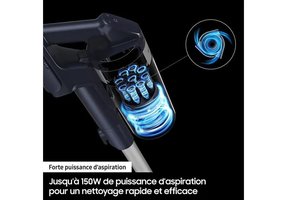Avec l’aspirateur balai jet 60 turbo vs15a6031r4 de samsung, aspirez plus efficacement grâce à une puissance d’aspiration jusqu’à 150 aw. Le moteur digital inverter optimise le flux d’air grâce à ses lames soudées en aluminium. Il délivre ainsi jusqu’à 410w de puissance.