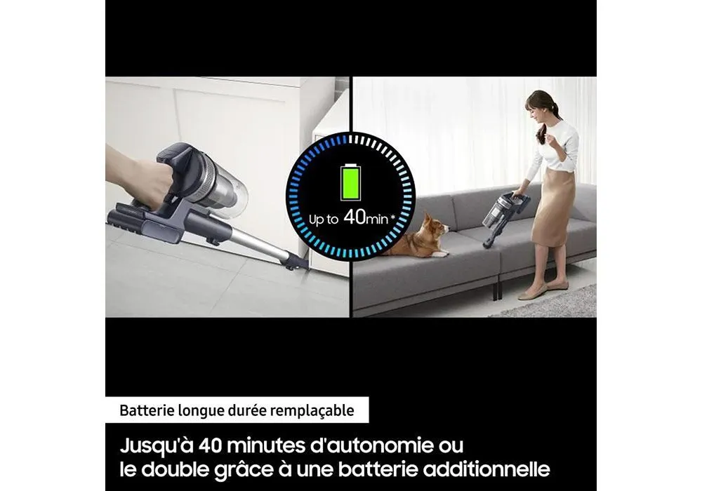 La batterie Samsung permet une utilisation standard jusqu’à 40 min. Vous pouvez facilement détacher et remplacer la batterie. Stockez et rechargez votre aspirateur avec plus de flexibilité grâce à la station de chargement 2-en-1. Vous pouvez la fixer au mur ou tout simplement l’utiliser indépendamment
