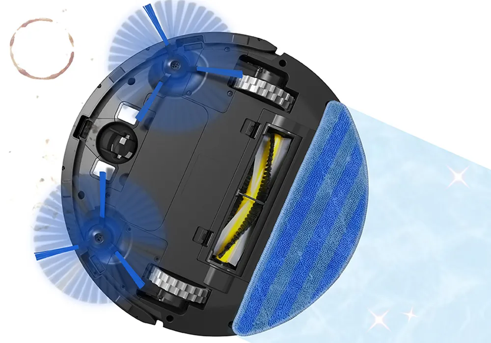 Lors de son cycle de nettoyage il balaye les poussières et autres saletés du quotidien, les aspire grâce à sa puissante turbine d’aspiration, puis passe la serpillère pour une finition soignée.
