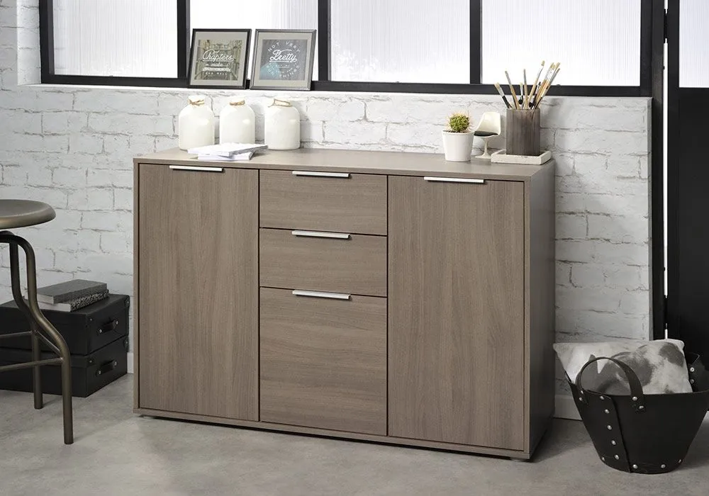 Le meuble enfilade Axel parfaitement optimisé offre de nombreux rangements : 3 tiroirs ainsi que 2 portes derrière lesquelles vous pourrez ranger vos affaires, vaisselles, documents et autres objets. Son plateau supérieur peut également être utilisé pour apposer des objets de décorations, cadres photos, souvenirs de voyage,…