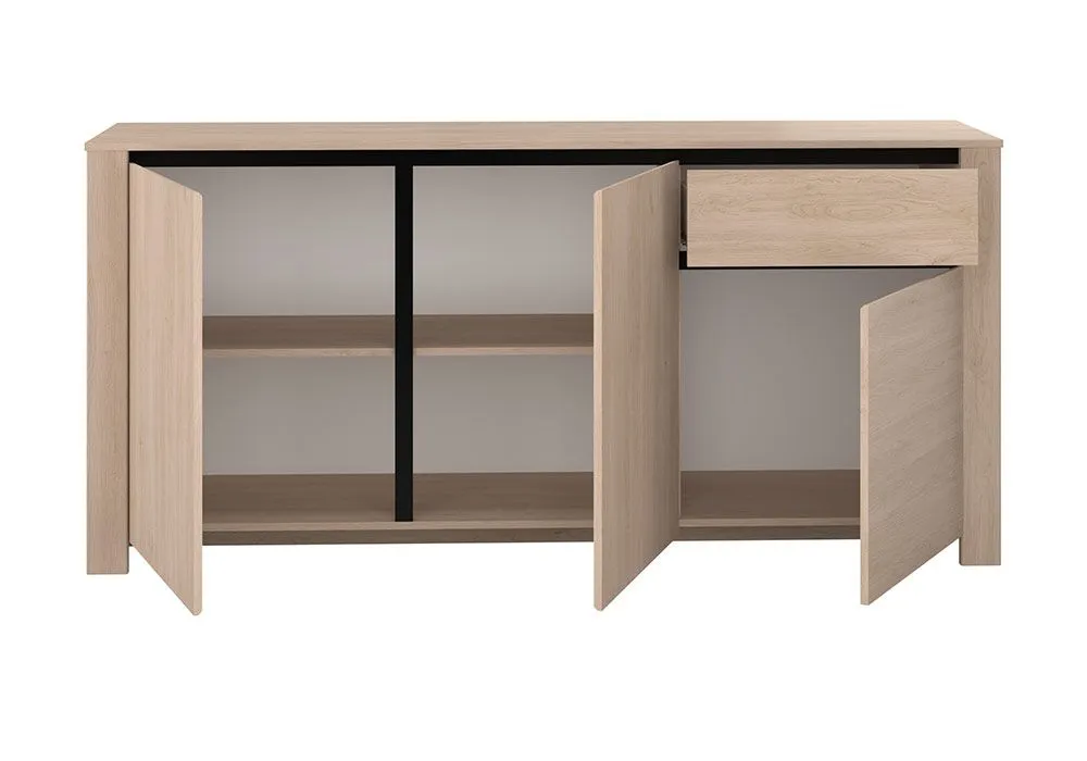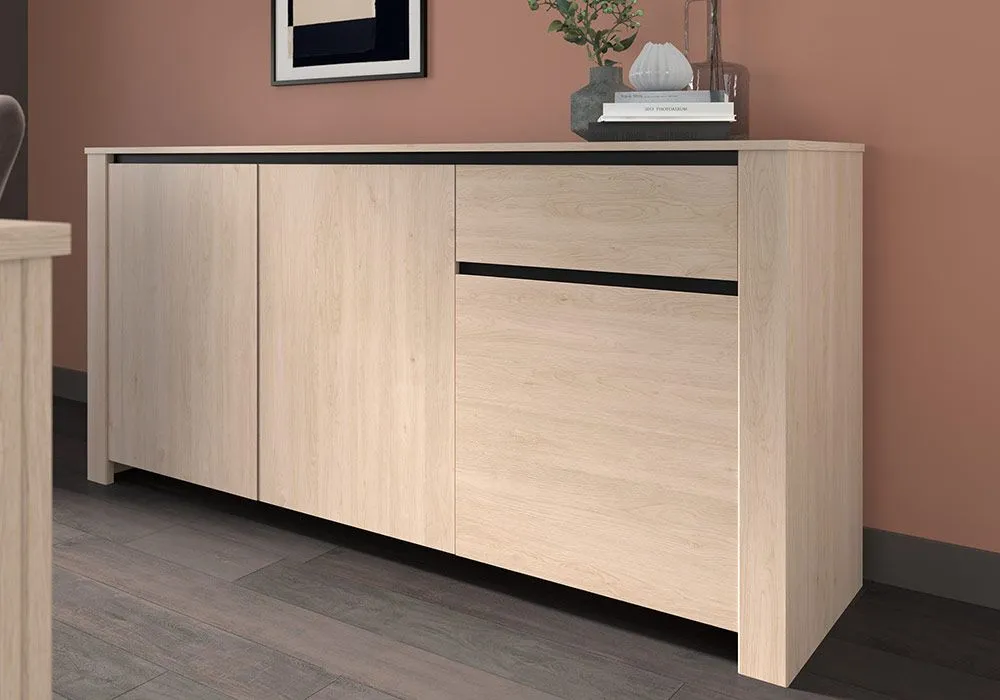 Le buffet bas Jim au style moderne, élégant et ergonomique grâce à ses rangements dissimulés sous 3 grandes portes et un tiroir. Son aspect épuré lui permet de trouver sa place dans diverses pièces de votre intérieur.