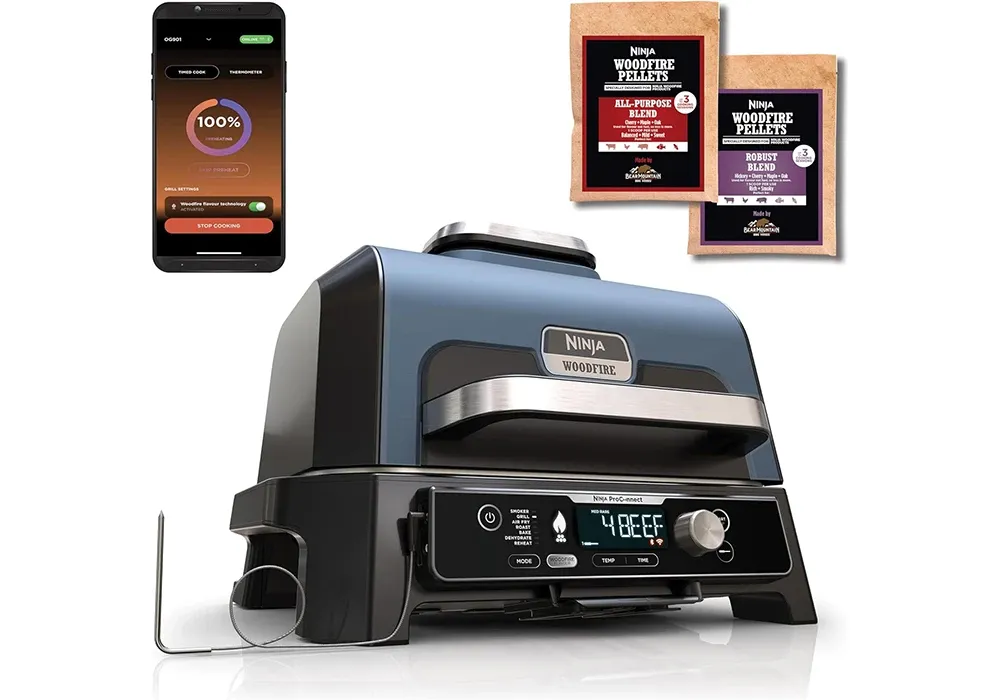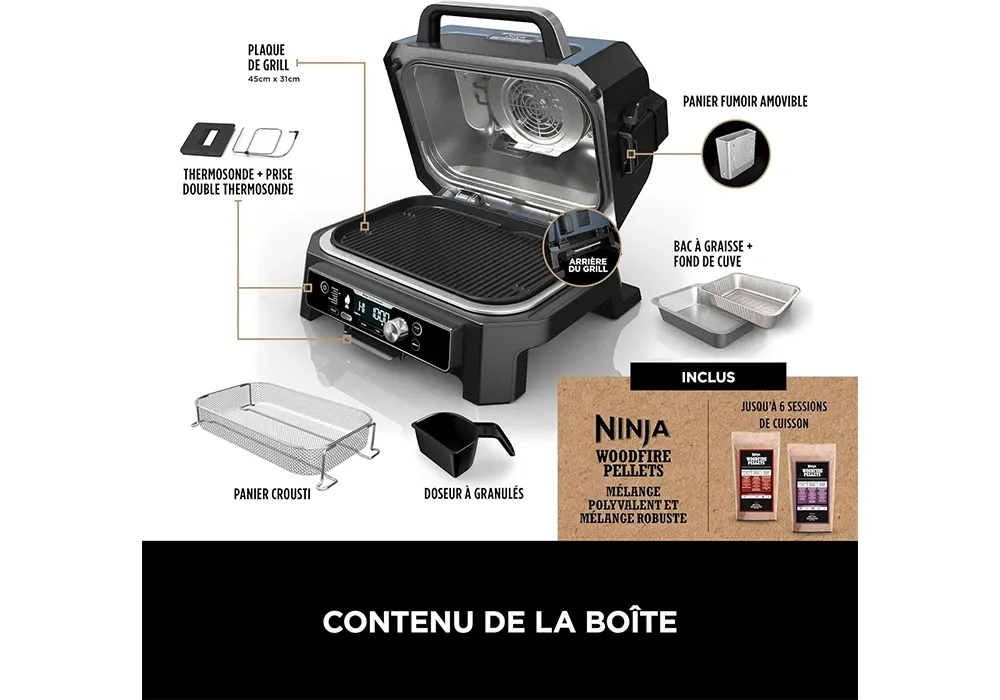 Votre barbecue comprend un kit d’essai de granulés Woodfire de chaque mélange, ainsi qu’un doseur pour ajouter la quantité idéale à chaque fois. Des granulés de bois supplémentaires peuvent être achetés directement auprès de Ninja.