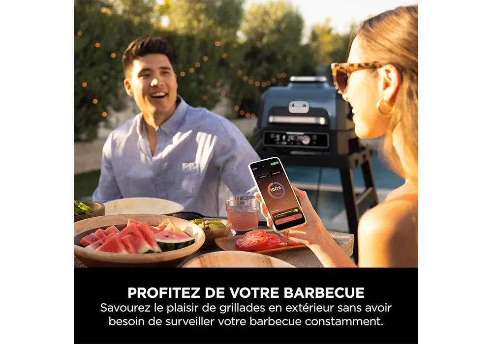 Le barbecue électrique et fumoir Ninja Woodfire Pro Connect XL vous permet de contrôler votre barbecue et la progression de la cuisson directement depuis votre téléphone, vous offrant une totale liberté pour vous détendre et passer du temps précieux avec vos amis et votre famille. Des résultats sur mesure. Pas de surveillance constante du barbecue. La maîtrise totale de la cuisson est entre vos mains.