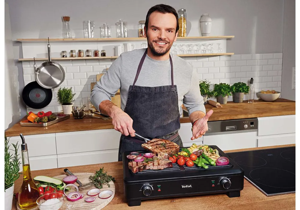 Avec le barbecue d’intérieur Tefal quasiment sans  fumée, savourez de délicieuses grillades toute l’année. Sa technologie dédiée bouclier anti-fumée garantit 70% de fumée et d’odeur en moins, pour une réduction significative des odeurs et de la fumée. Pratique il est doté de 2 surfaces de cuisson avec thermostats indépendants pour cuire simultanément à 2 températures différentes, tous vos aliments comme les viandes, poissons et légumes. Les possibilités sont infinies !