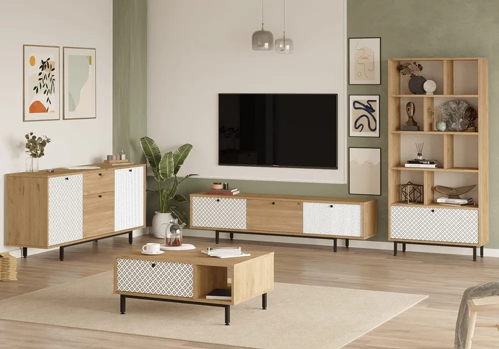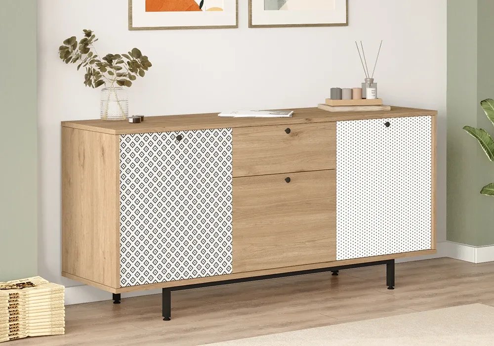 Craquez pour le style de ce superbe buffet à installer dans votre intérieur. Muni de 3 portes et 1 tiroir, ce bahut bas ravira votre décoration grâce à son design actuel et original. Trouvez la place idéal dans votre chambre ou dans votre salon et complétez votre décoration à l’ambiance moderne et naturelle.
