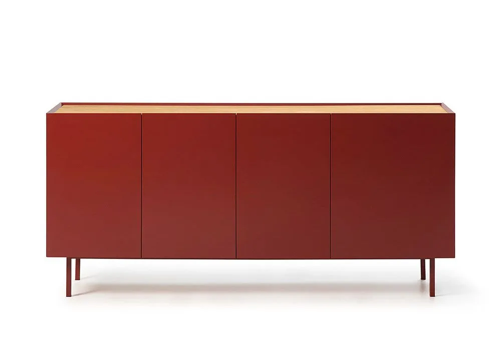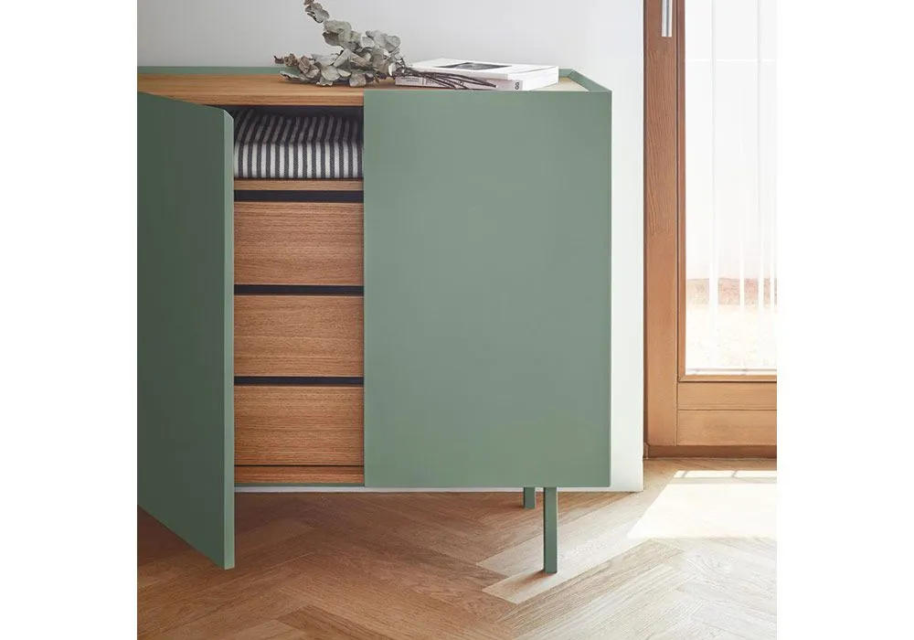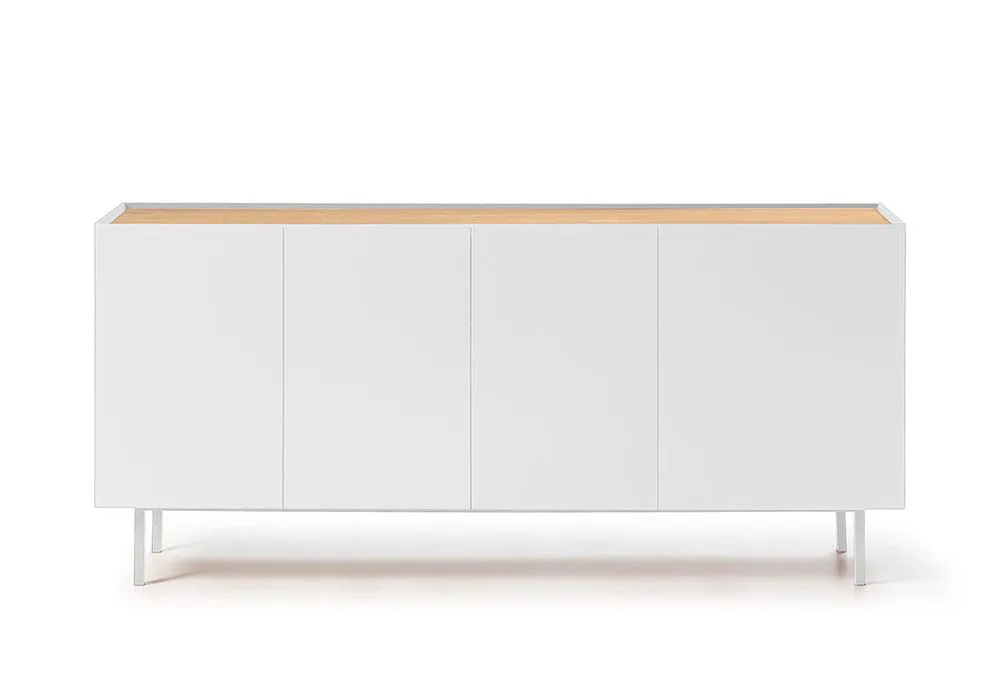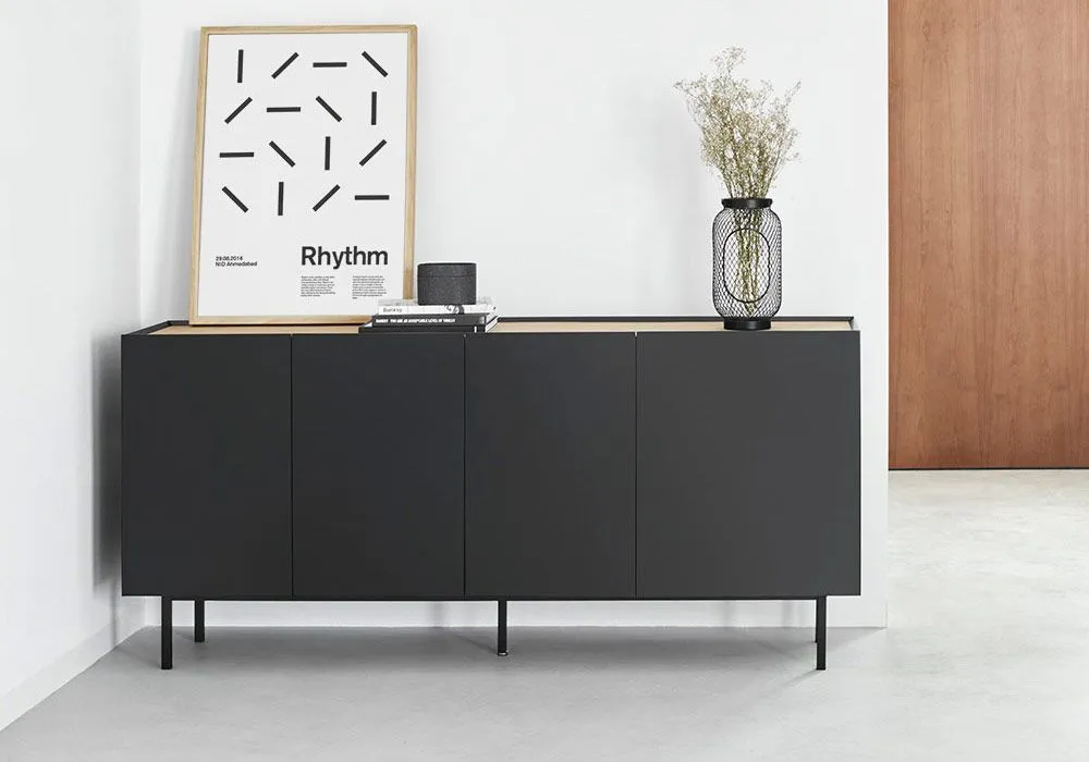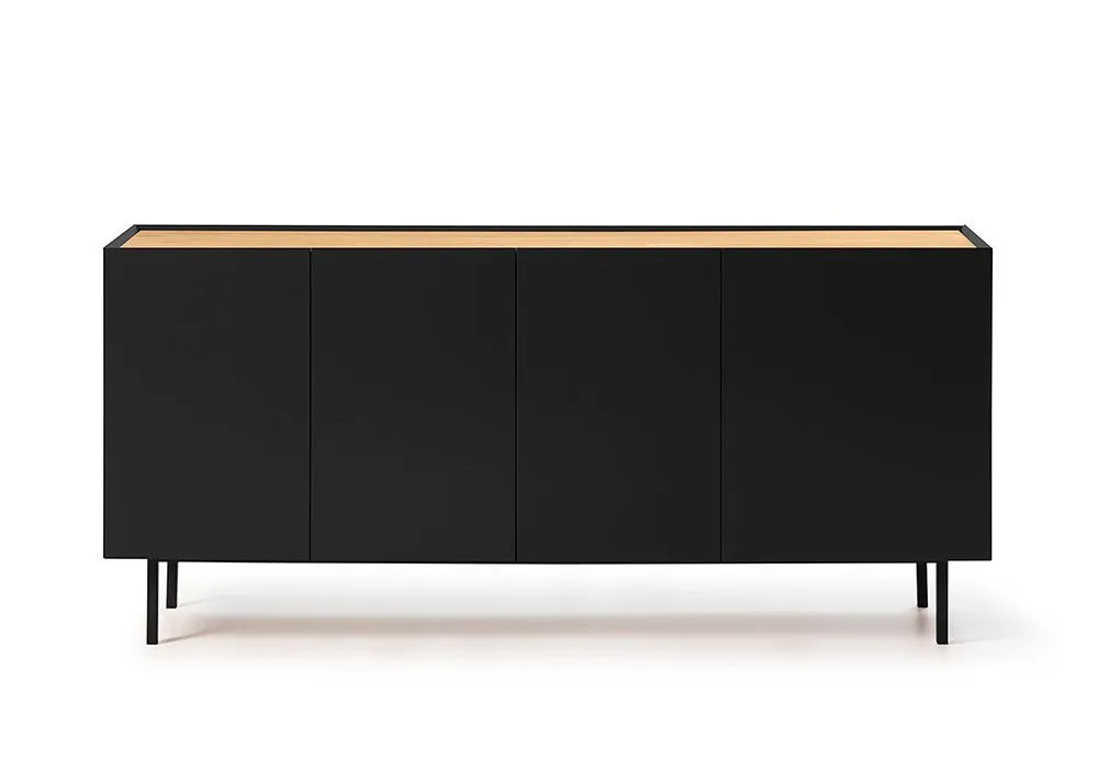 Le buffet Arista est muni de 4 portes et 3 tiroirs, dont une venant dans des dimensions différentes, caractéristique commune à la gamme et rajoutant à sa singularité. A l’intérieur, un bel espace de rangement réalisé entièrement en laminé couleur chêne est composé de deux étagères fixes et de 3 tiroirs. Toutes les charnières ont un système « soft-closing » silencieux permettant la fermeture des portes en douceur. Un pied central assure un appui ajustable à tout sol même dénivelé.