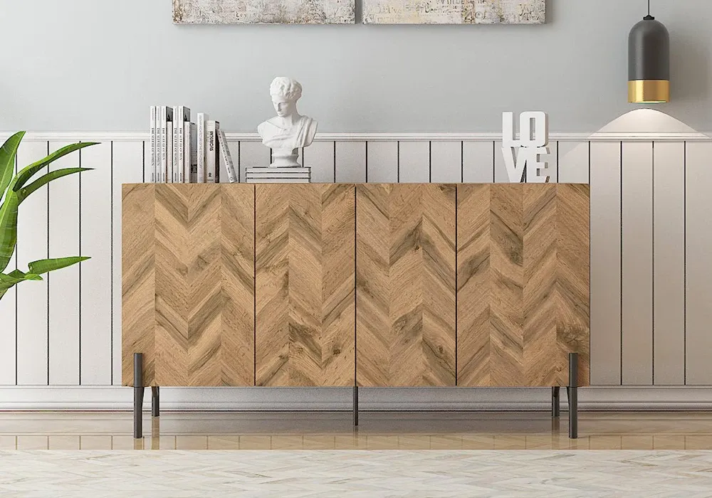 Le buffet bas de la collection Vadella allie fonctionnalité et design Les portes arborent un motif géométrique subtil, ajoutant une touche d’originalité. Les pieds noirs garantissent stabilité et robustesse. Il dispose de 4 portes pour ranger vos affaires : livres, décorations, vaisselle, etc.