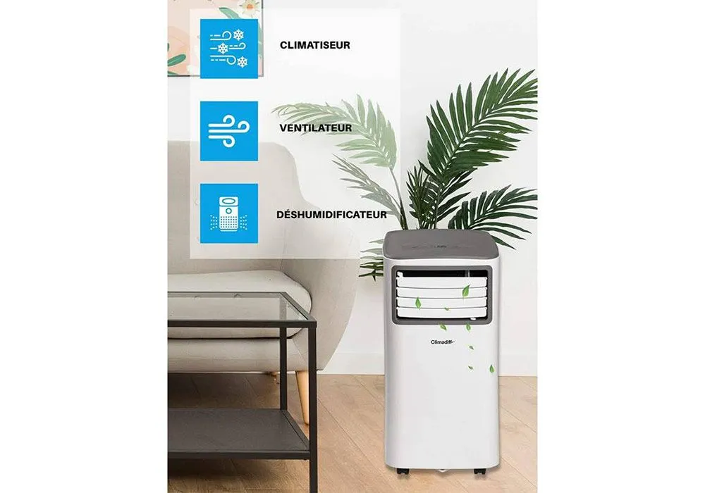 3 en 1, le climatiseur mobile CLIMA9K1 s’adapte parfaitement à vos besoins, pour réguler la température, mais aussi pour ventiler et pour déshumidifier l’air d’une pièce. Le climatiseur mobile vous offre un confort optimal, avec ses 2 vitesses de ventilation au choix, son mode automatique, son fonctionnement programmable avec minuteur jusqu’à 24h, et son affichage électronique.