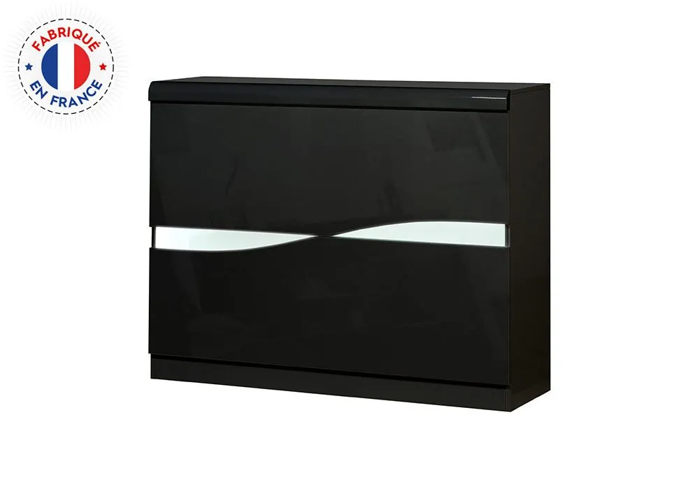 Séjour moderne en panneau de particules ép. 18 et 22 mm recouvert de papier laqué noir brillant. Dessus gauche, montants et faces tiroirs en panneau de particules ép. 18 et 22 mm recouvert de papier laqué noir brillant.