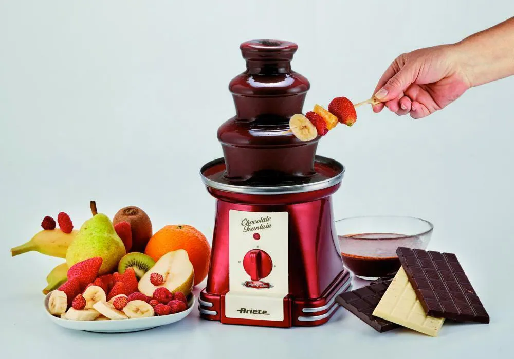 La fontaine à chocolat Party Time Ariete dispose d’une puissance de 90W et d’une tour en acier inoxydable. Un chocolat extra doux qui coule sans interruption par la fontaine et reste chaud dans le récipient. Flux en cascade avec double variateur d’intensité, idéal pour des coupes de glaces, desserts au chocolat fondu ou pour y plonger des friandises.