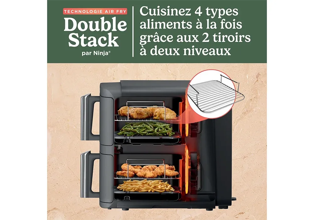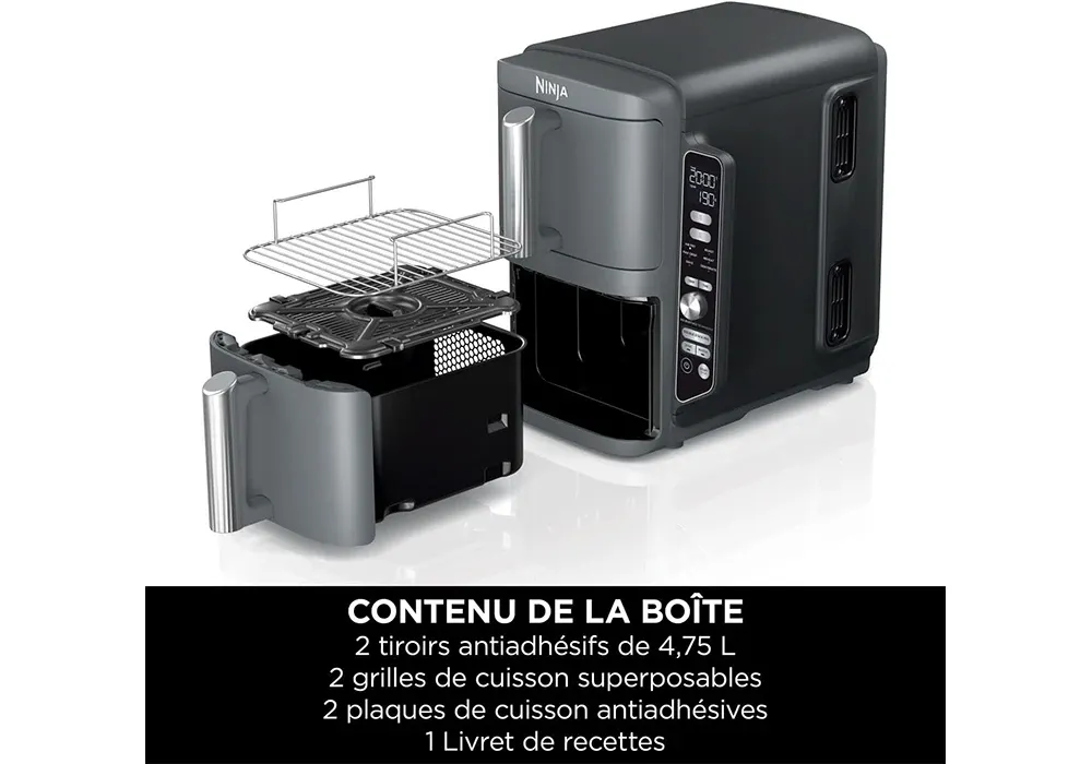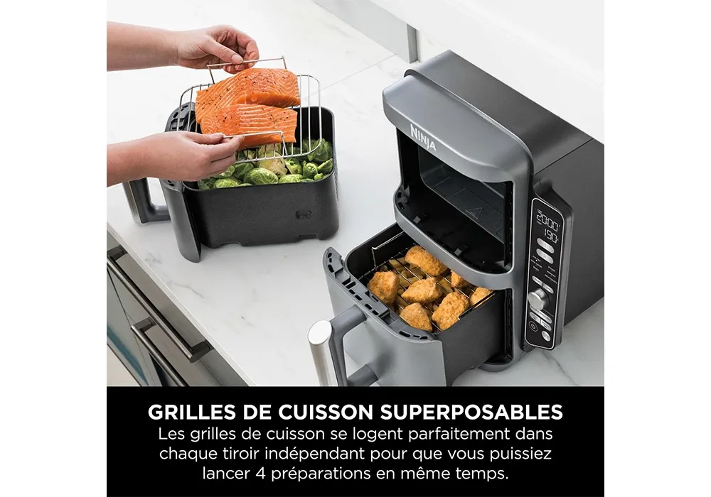 Sa puissance de 2470W assure une montée en chauffe très rapide. Grâce à ses 2 tiroirs de cuisson indépendants, vous pourrez choisir des modes, des durées et des températures de cuisson différents dans les deux tiroirs.