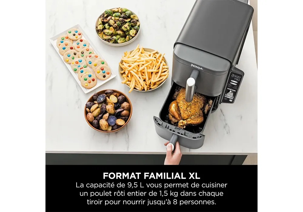 Idéale pour les familles nombreuses (6 à 8 personnes), cette friteuse sans huile 9,5L permet de cuisiner jusqu’à 75% plus rapidement qu’avec les fours traditionnels. Chaque tiroir peut contenir un poulet de 1,6 kg ou jusqu’à 1,4 kg de frites, vous pouvez donc cuisiner un plat et son accompagnement dans le même appareil et les servir en même temps !