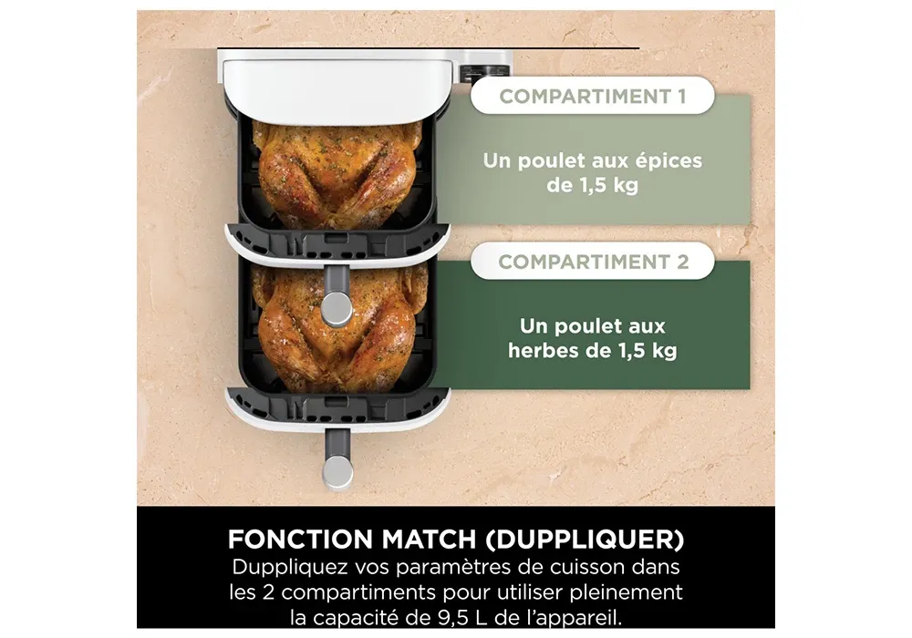 2 tiroirs à contrôle indépendant : Choisissez différents modes, temps de cuisson et températures pour chaque tiroir, puis synchronisez la fin de cuisson grâce à la fonction SYNC, permettant de servir tous vos plats en même temps.