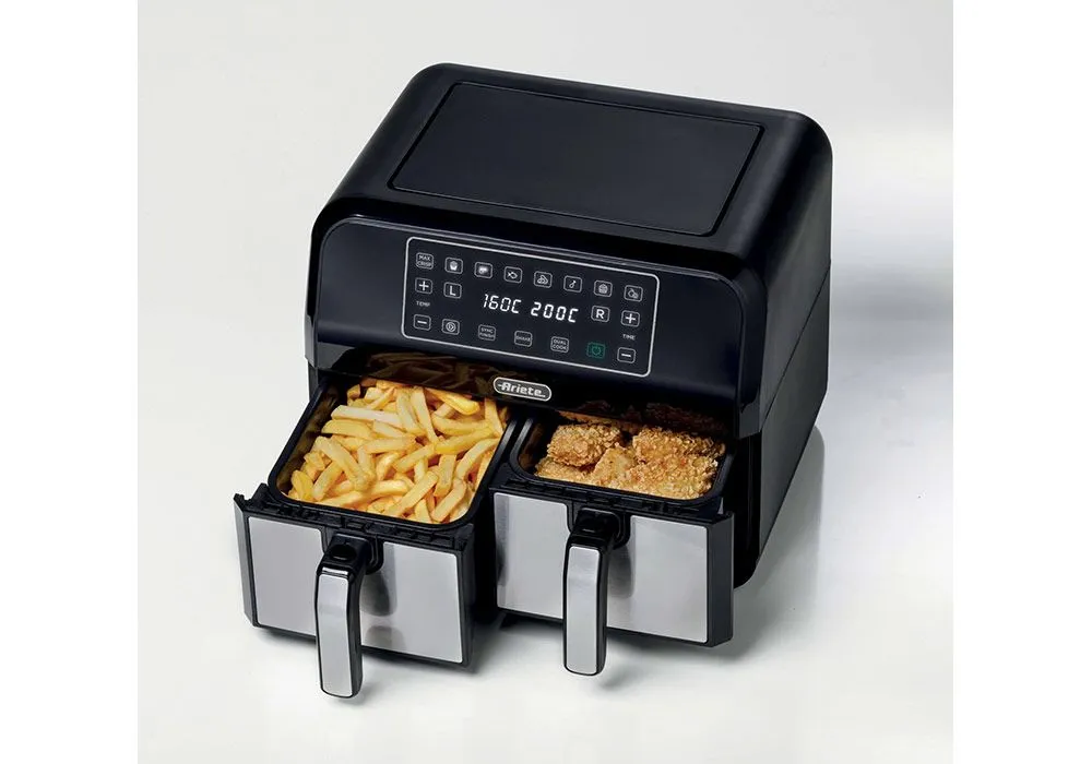 Grâce à ses 2 paniers séparés de 4 litres chacun,la friteuse Airy Dual d’Ariete vous permet de cuire jusqu’à 3,4 kg de frites en une seule fois ! Des frites, mais pas seulement, aussi des croquettes, du poisson, de la viande et bien d’autres aliments panés, soit surgelés et prêts à frire, soit frais et juste panés, grâce à 8 programmes préétablis.