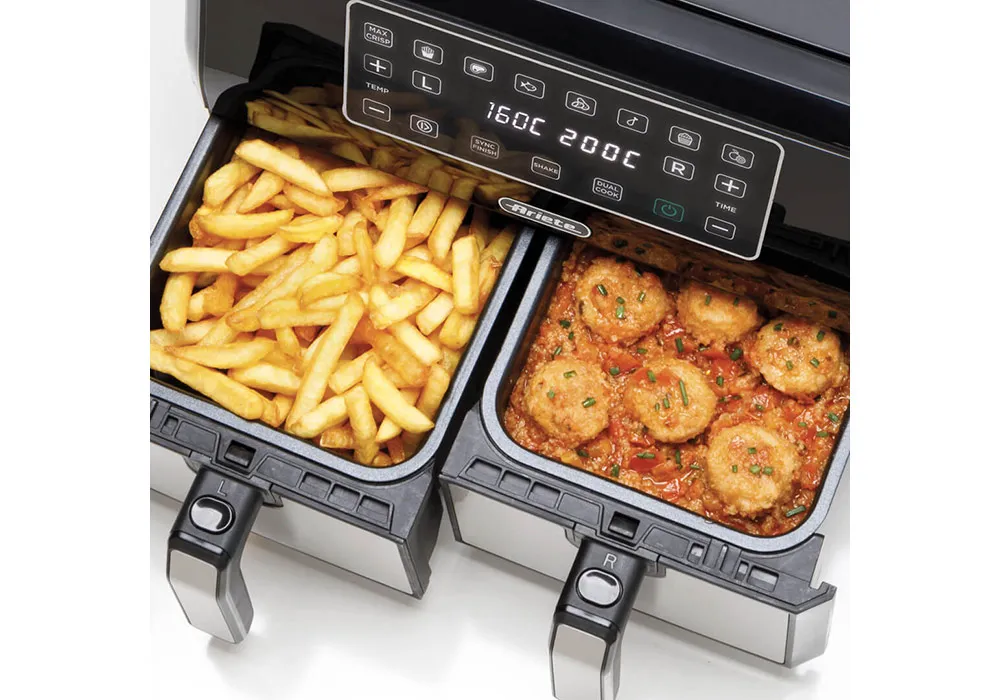 Avec la friteuse Airy Fryer Dual, vous pouvez faire frire n’importe quel plat en double quantité, en utilisant seulement une cuillère d’huile pour des frites saines et savoureuses en même temps.