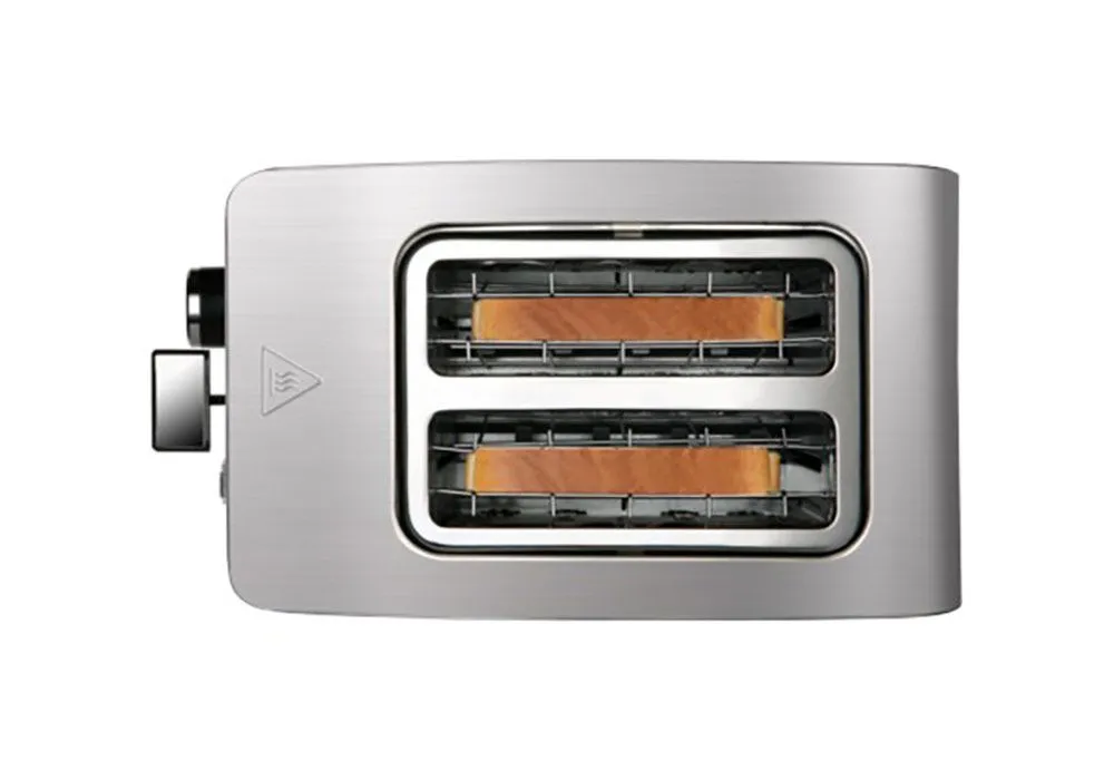 Grille-pain 2 fentes en acier inoxydable : pour du pain grillé et des tartines comme vous les aimez. Puissance 850W et régulateur de temps de grillage pour un pain parfaitement grillé en un rien de temps
