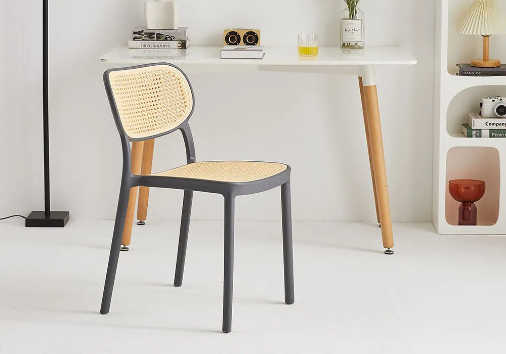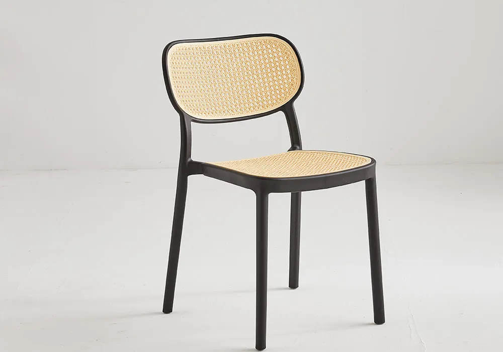 Structure en résine intérieur / extérieur, coloris noir, gris ou vert / jaune, dossier et assise façon cannage.