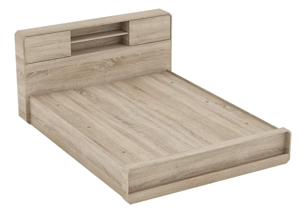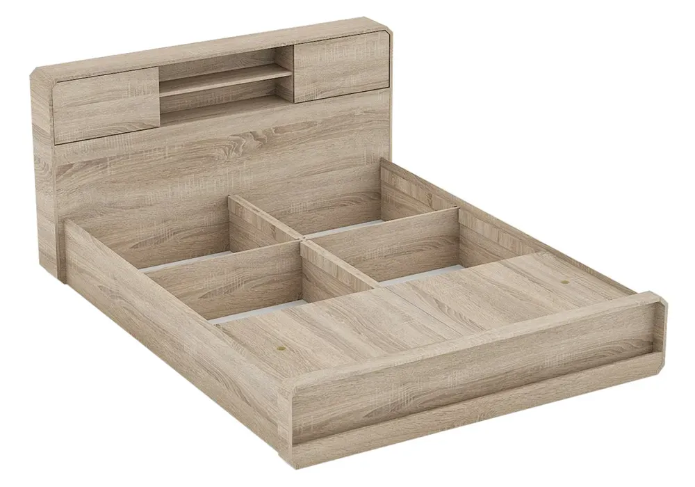 Structure en panneau de particules mélaminé recouvert de papier décor oak. LIT vendu AVEC SOMMIER, SANS MATELAS.