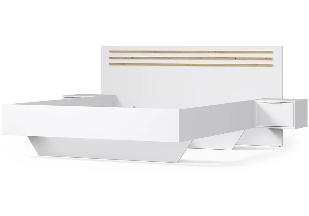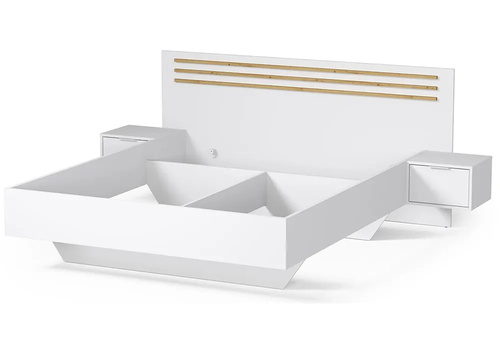 Structure en panneau de particules recouvert de papier décor coloris blanc / chêne. Lit 160x200cm avec 2 chevets intégrés, vendu AVEC SOMMIER SANS MATELAS.