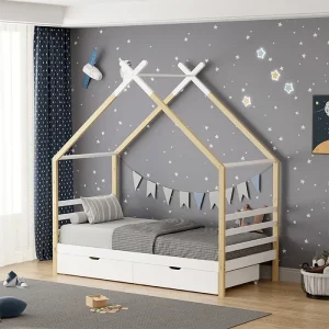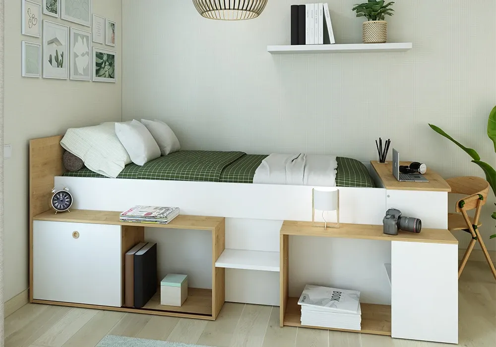 Doté d’une literie 90x200cm, il garantit un confort optimal pour des nuits paisibles. Le plan bureau intégré est parfait pour les devoirs, les activités créatives ou le temps de lecture, tandis que le rangement avec porte coulissante et étagères offre un espace pratique pour organiser livres, jouets et fournitures scolaires.