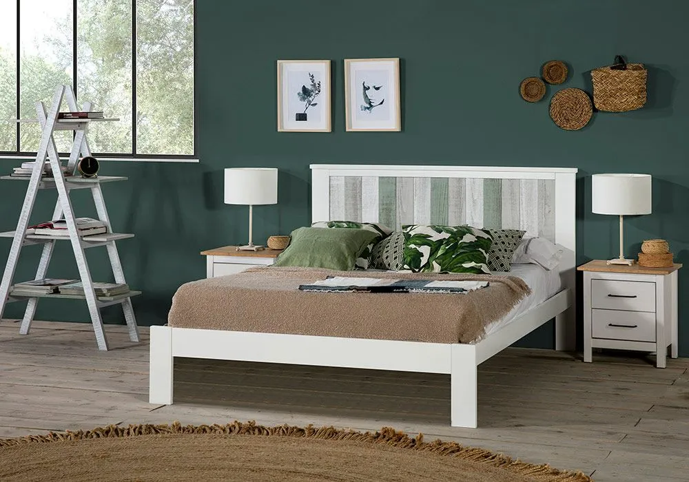 Structure en PIN MASSIF ciré coloris blanc / vert, vendu AVEC SOMMIER, SANS MATELAS.