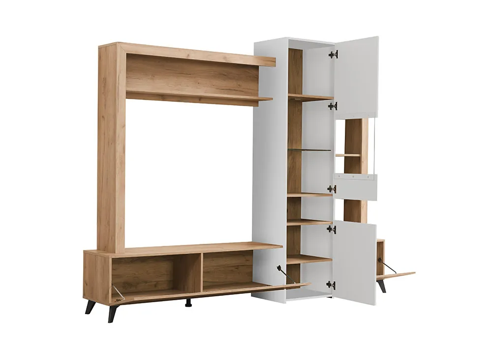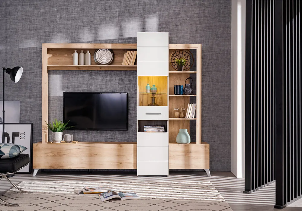 Le living TV Burgos offre un espace suffisant pour ranger vos appareils multimédias, vos livres et toutes sortes d’articles plus petits. Il sera également idéal pour afficher des objets décoratifs, des cadres photo ou même des plantes en pot.
