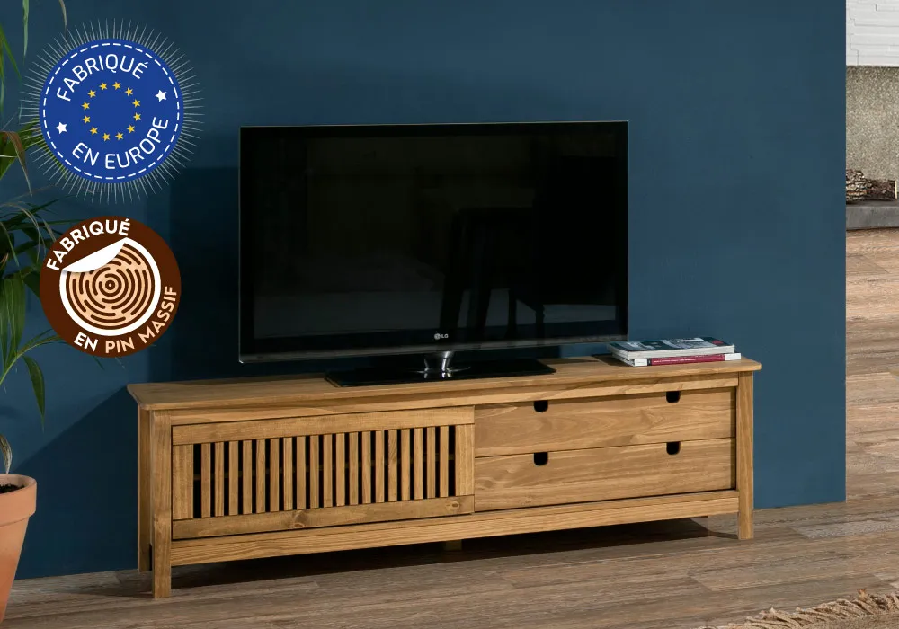 Avec ses matières brutes naturelles telles que le pin massif et ses lignes épurées, le meuble TV de la collection Bruna apportera fraicheur et authenticité à votre maison. Inspirée du style bord de mer, il donnera un air de vacances à votre intérieur.