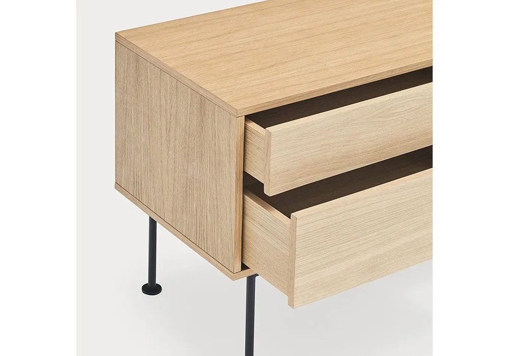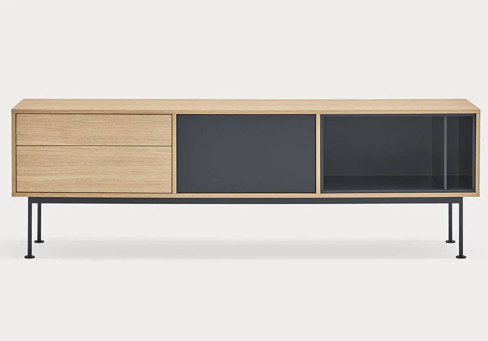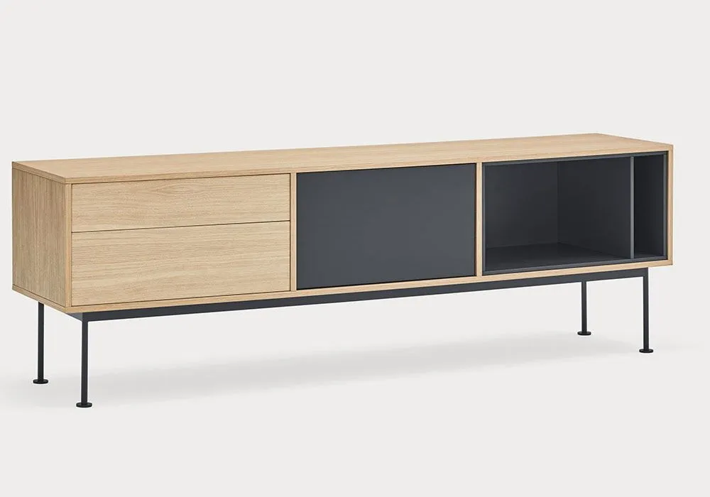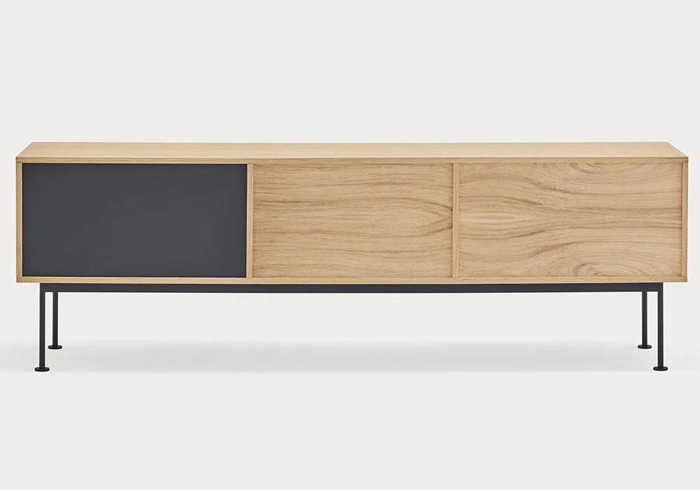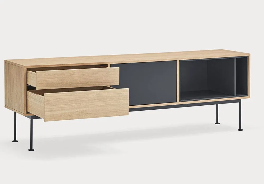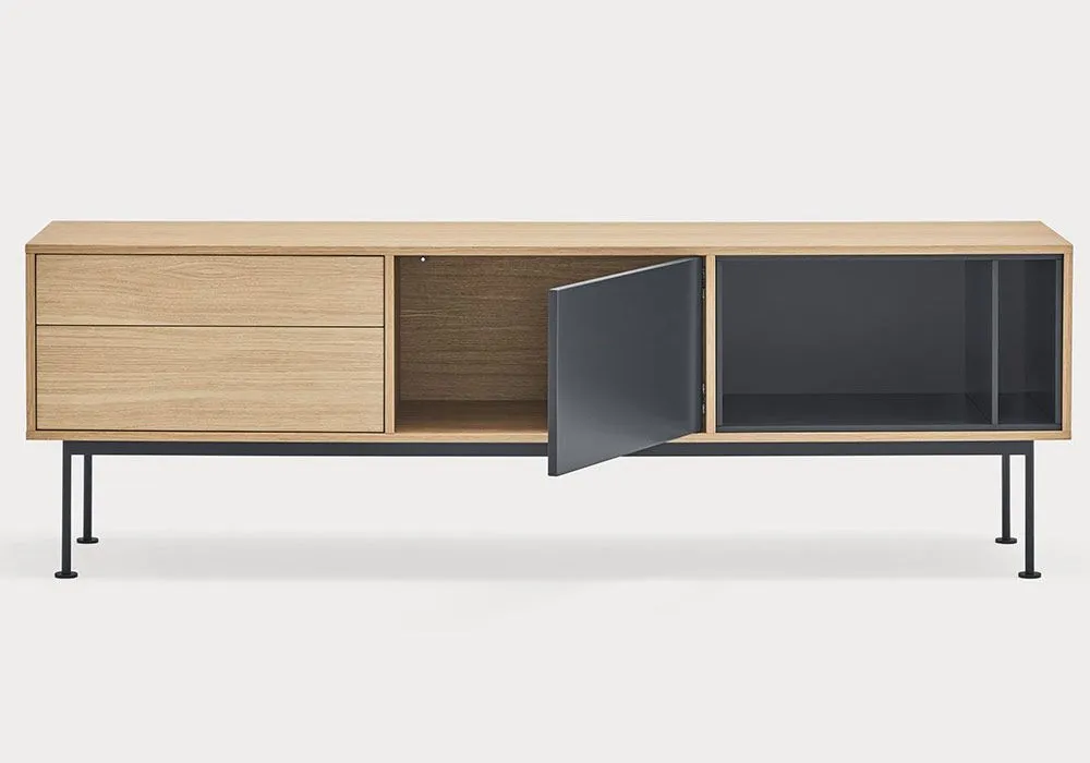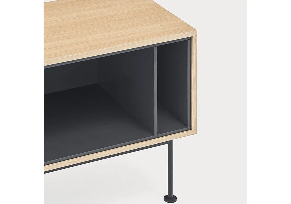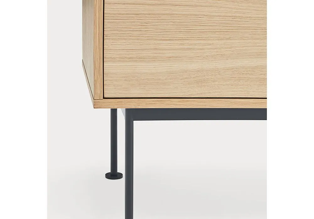 Yoko est en placage de chêne à l’exception des façades colorées, en MDF laqué.‎ Les pieds sont métalliques et laqués de la même couleur que les façades.