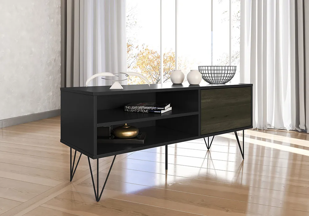 Aménagez votre intérieur avec les meubles de la collection Zeta dans un style chic sobre et élégant. Doté de pieds épingles noir, le meuble de télévision dispose d’une structure en panneaux de bois de particules. Ce meuble TV rend l’espace somptueux et lumineux. Confort et fonctionnalité s’unissent pour donner un style expressif à votre séjour.