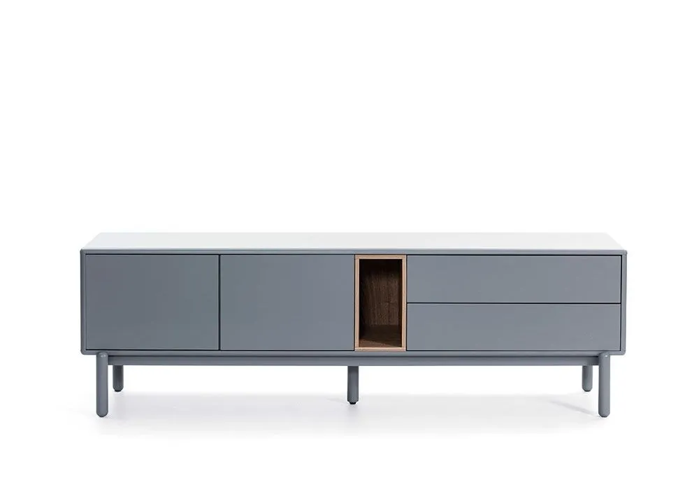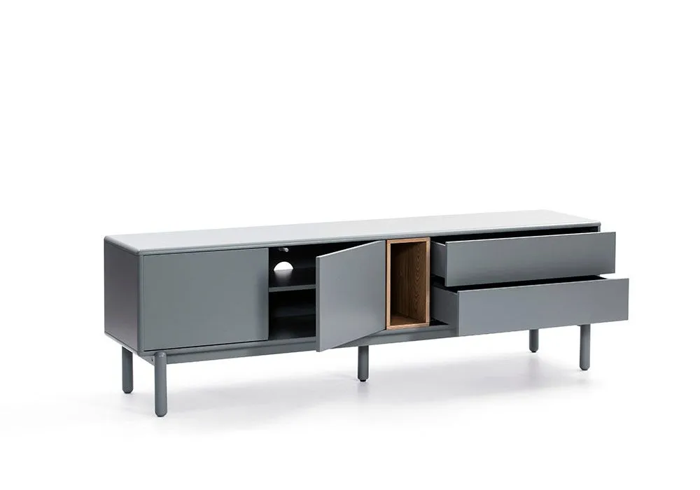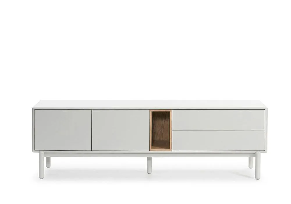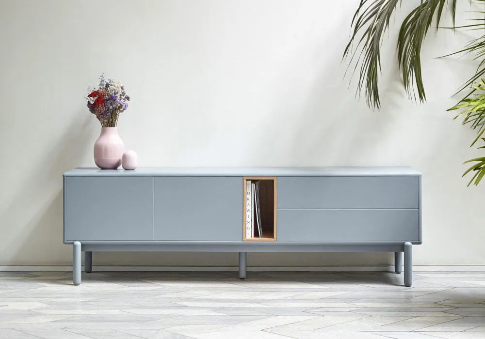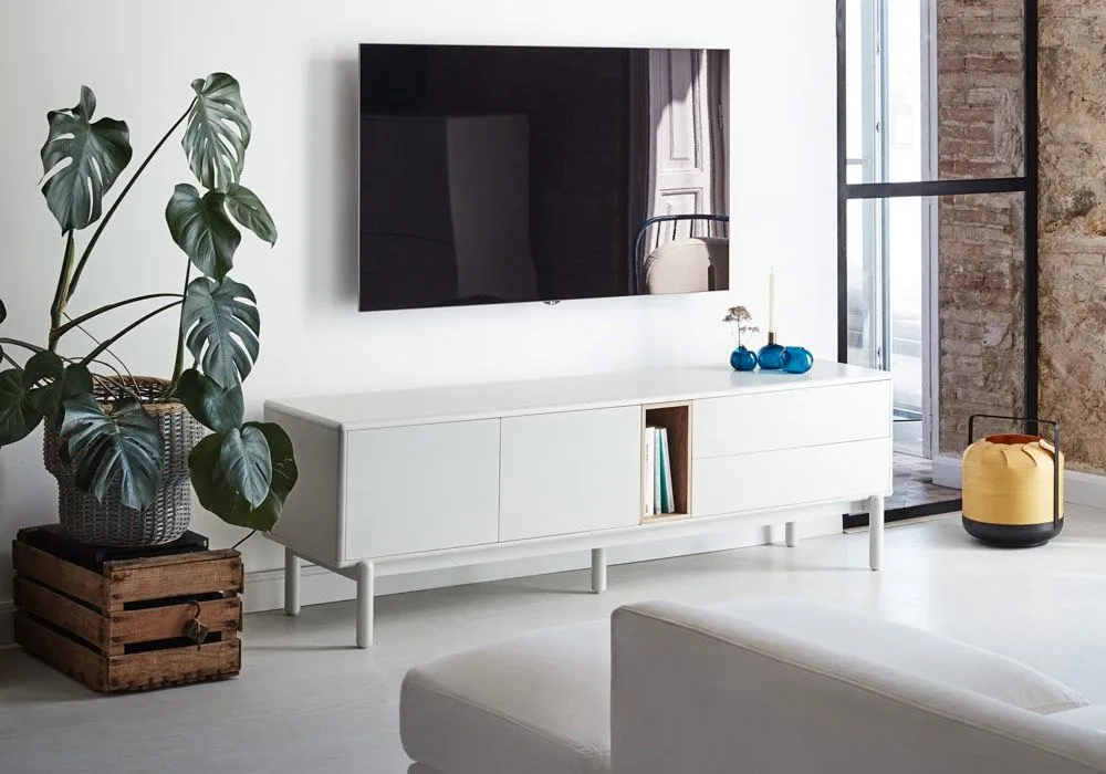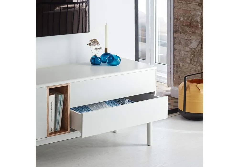 Avec ses coloris crème ou gris, le meuble TV Corvo met en valeur la niche en bois de chêne qui joue ainsi les contrastes pour apporter une touche de chaleur à l’ensemble.
