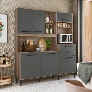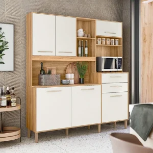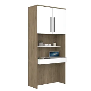 Structure en panneau de particules, décor faux bois chêne coloris miel finition mate. Façades en panneau de particules décor blanc verni polyester finition brillante.