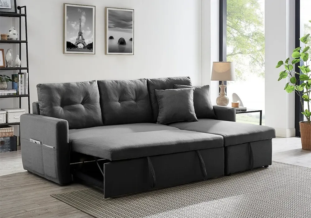 Ce salon d’angle est convertible en lit, avec une réversibilité gauche ou droite selon vos besoins, ce qui en fait une solution idéale pour les petits espaces ou pour recevoir des invités.