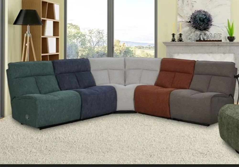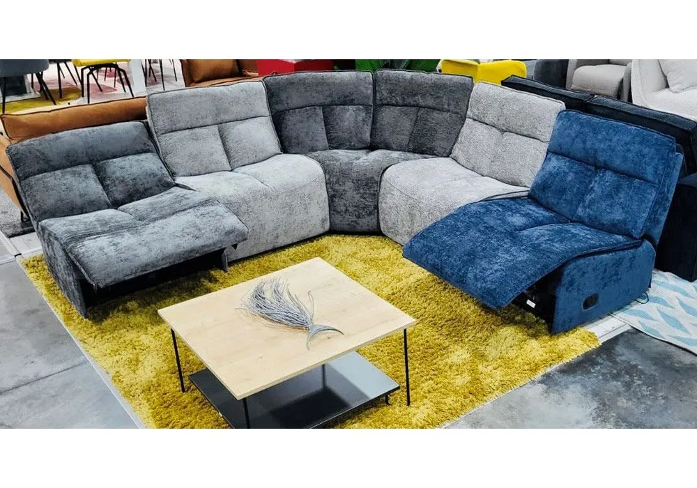 2 chauffeuse gris clair, 1 angle gris foncé, 1 chauffeuse relax manuel avec 3 positions bleu, 1 chauffeuse électrique multi position gris foncé.