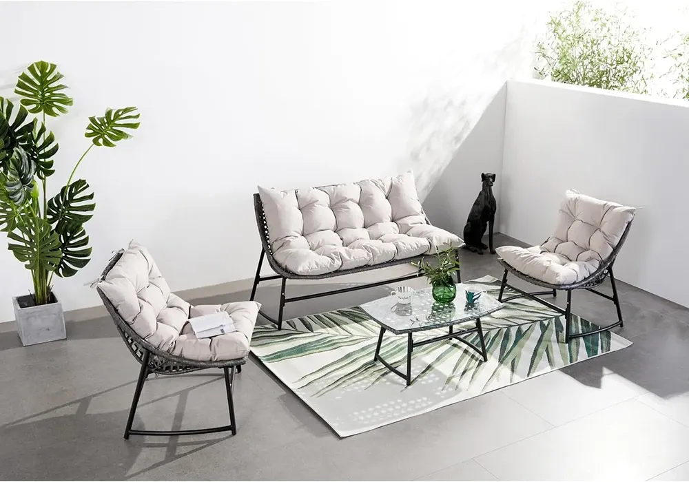 La structure en acier assure une robustesse et une durabilité exceptionnelles, tandis que l’osier noir tressé ajoute une touche de modernité et de raffinement. Les coussins d’extérieur imperméables et résistants offrent un confort optimal et une protection contre les intempéries, garantissant une utilisation prolongée sans compromis sur le style.