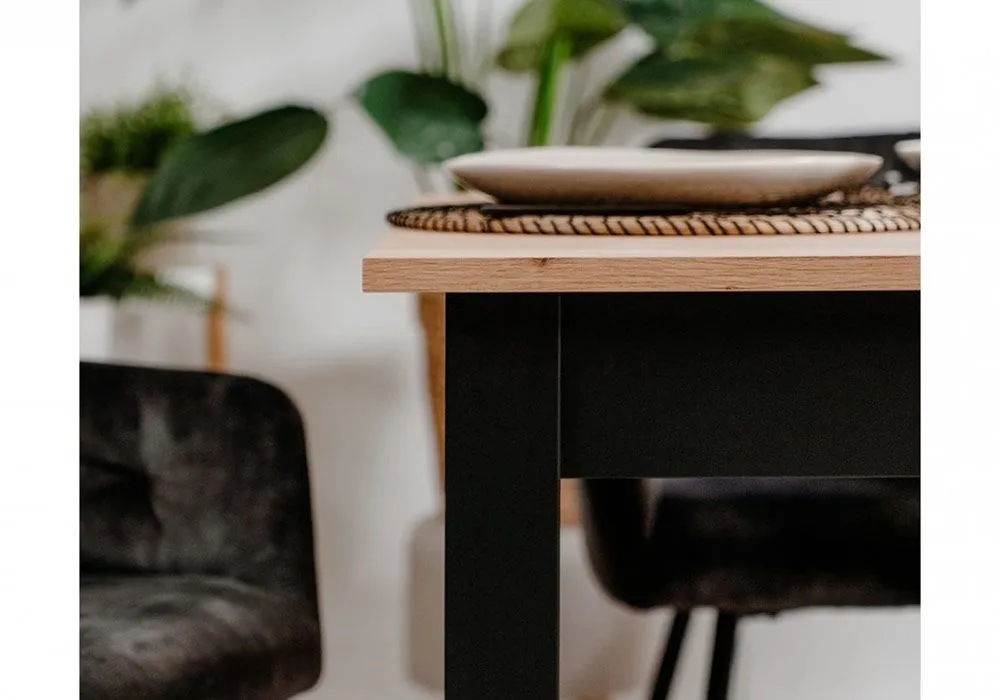 Structure en panneau de particules mélaminé, plateau chêne, piétement coloris noir, 131/177x80xH76cm.