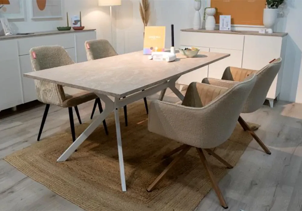 Les pieds en métal coloris blanc mat ajoutent une touche de sophistication et de durabilité. Cette table est idéale pour sublimer votre salle à manger et créer un espace convivial pour des moments inoubliables en famille ou entre amis.