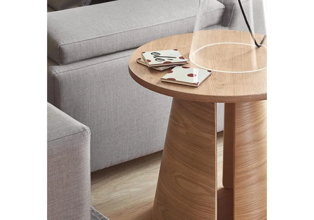 La table de coin CEP est composée d’un plateau rond qui s’appuie sur une base formée de deux pièces de bois cintré. Cette table d’appoint originale au niveau du piètement se dote d’une base large en forme de cône ouvert au centre.