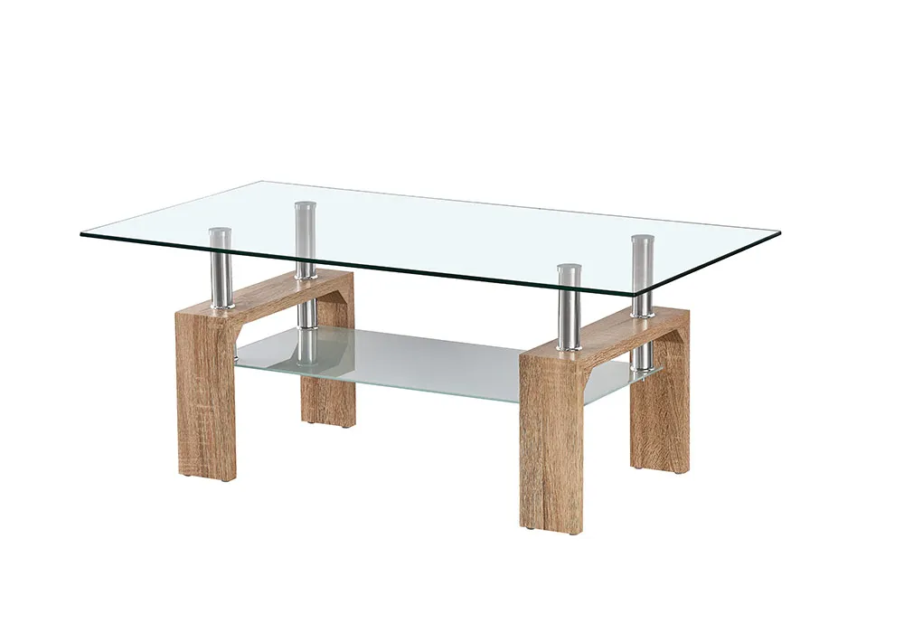 La table de salon moderne Podium trouvera facilement sa place dans votre salle de séjour. Les pieds élégant en mdf couleur bois se complètent à la perfection avec le dessus de table en verre transparent